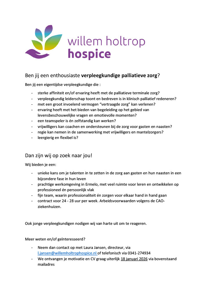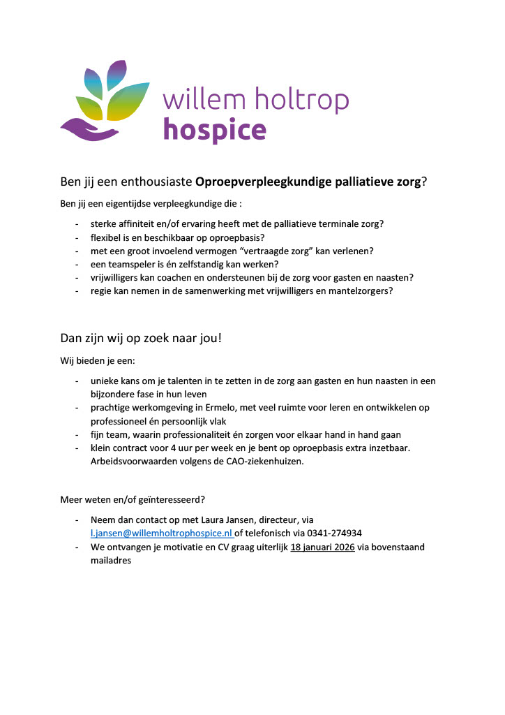 Ter versterking van ons team zijn wij op zoek naar een verpleegkundige palliatieve zorg die met professionaliteit én compassie het verschil wil maken. Werk jij graag in een omgeving waar tijd, nabijheid en samenwerking centraal staan? Dan nodigen wij je van harte uit om te reageren.